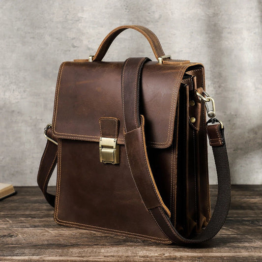 Besace : Plus spacieuse, la besace en cuir est idéale pour y glisser ordinateur portable, documents et accessoires. Son style authentique séduit les citadins actifs.